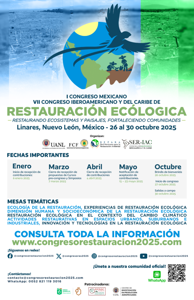 La Facultad de Ciencias Forestales de la Universidad Autónoma de Nuevo León (UANL), la Red Mexicana para la Restauración Ambiental (REPARA) y la Sociedad para la Restauración Ecológica de Iberoamérica y el Caribe (SER-IAC) están organizando el I Congreso Mexicano y VII Congreso Iberoamericano y del Caribe de Restauración Ecológica, el cual se llevará a cabo del 26 al 30 de octubre del 2025 en las instalaciones de la Facultad de Ciencias Forestales de la UANL en la ciudad de Linares, Nuevo León, México. Este evento reunirá a académicos, instituciones educativas, organizaciones, empresas, profesionales y comunidades, quienes podrán compartir ideas, conocimientos, experiencias, lecciones aprendidas y proyectos sobre la Restauración Ecológica a escala local e internacional, las cuales estarán enmarcadas en líneas temáticas como: la ecología de la restauración, la dimensión humana y socioeconómica de la restauración ecológica, la restauración ecológica en el contexto del cambio climático, actividades restaurativas en espacios urbanos, suburbanos e industriales, innovación y tecnologías en la restauración ecológica, entre muchos otros.
